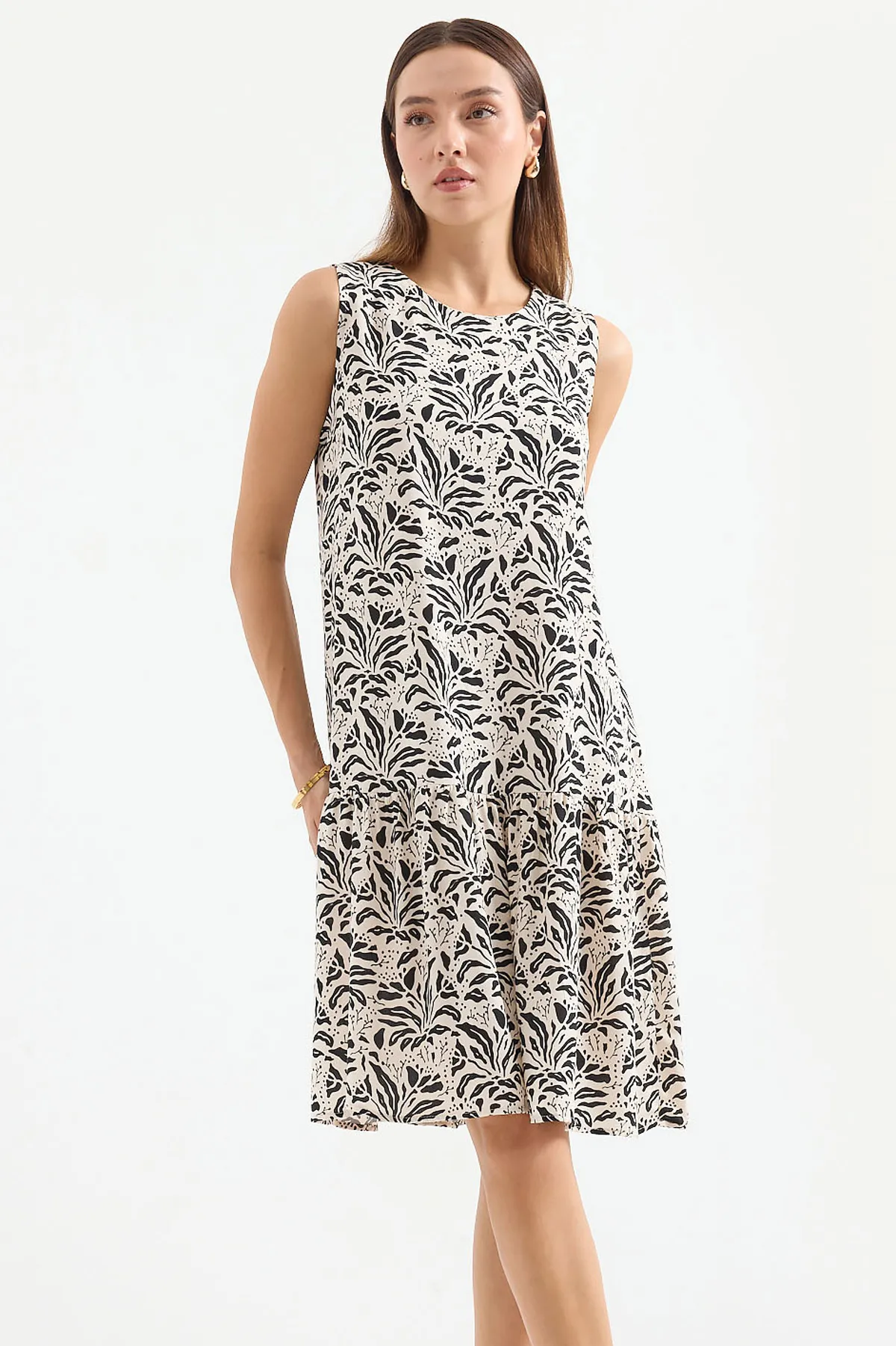 فستان نسائي ميدي كلوش بتصميم كتف مكشوف وحزام مجمع مع نقشة وتفصيل طبقات