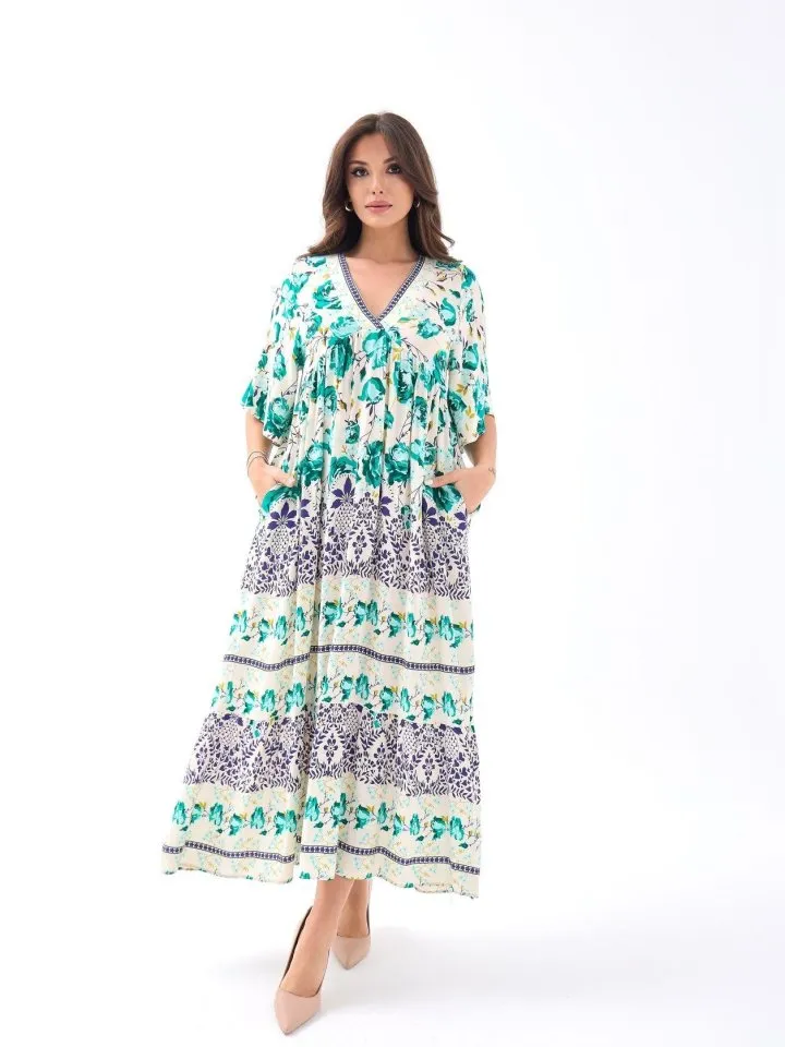 فستان ميدي كلوش بتصميم كتف مكشوف وأكمام بالون قصيرة مع حزام مجمع. يتميز بنقشة وتفصيل طبقات، مناسب للتنسيقات الصيفية الأنيقة والمشاوير اليومية للنساء.