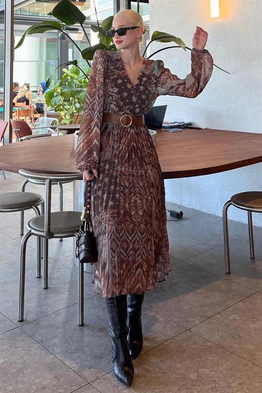 فستان نسائي ميدي كلوش بتصميم كتف مكشوف وحزام مجمع مع نقشة وتفصيل طبقات