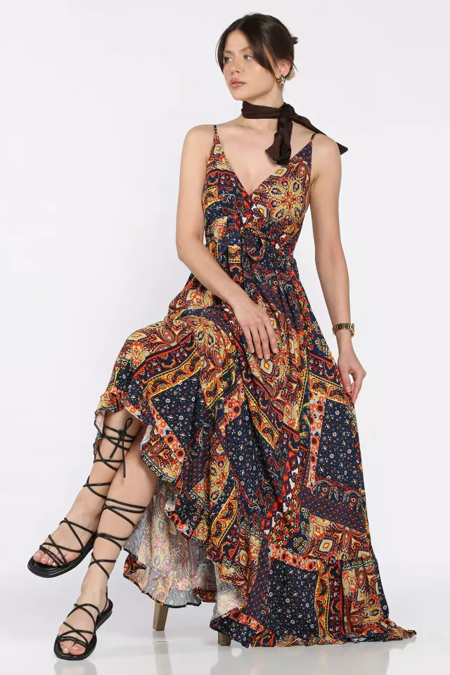 فستان نسائي ميدي كلوش بتصميم كتف مكشوف وحزام مجمع مع نقشة وتفصيل طبقات