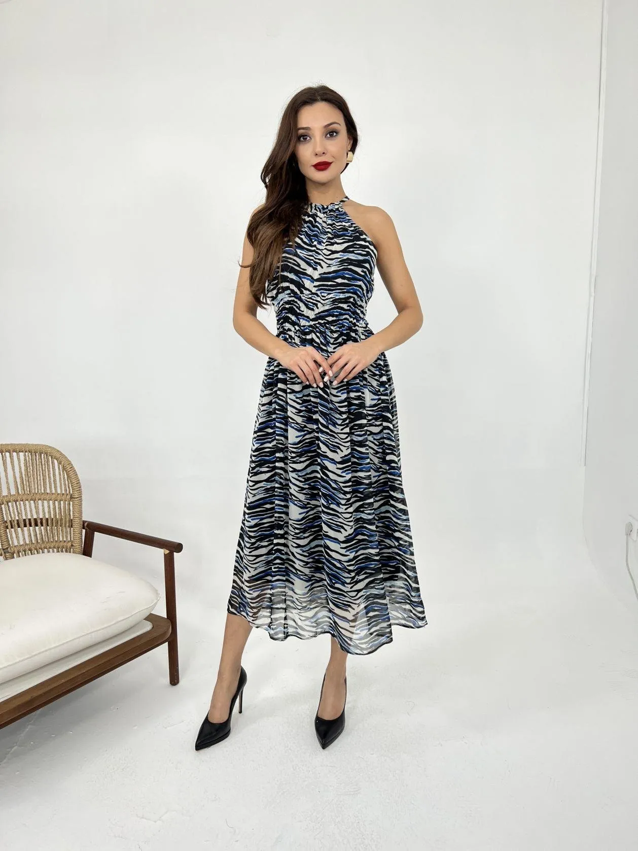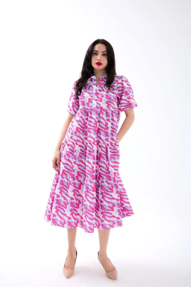 فستان ميدي كلوش بتصميم كتف مكشوف وأكمام بالون قصيرة مع حزام مجمع. يتميز بنقشة وتفصيل طبقات، مناسب للتنسيقات الصيفية الأنيقة والمشاوير اليومية للنساء.