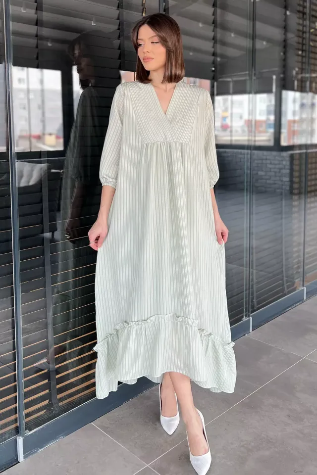 فستان ميني كلوش بياقة V وأكمام بالون قصيرة مع تنورة بكسرات. مزود بتبطين لتوفير الراحة، يناسب الأيام الصيفية والتنسيقات اليومية للنساء.