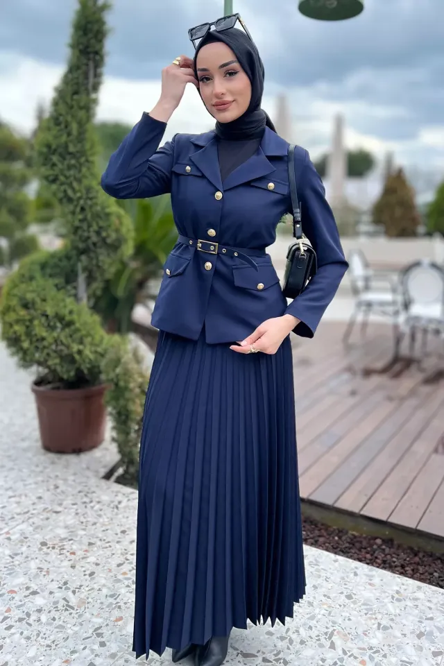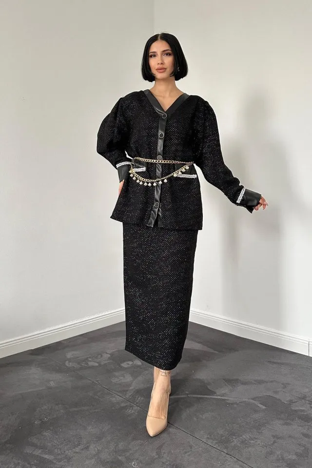 طقم تنورة ساتان منقوش بأكمام طويلة للنساء