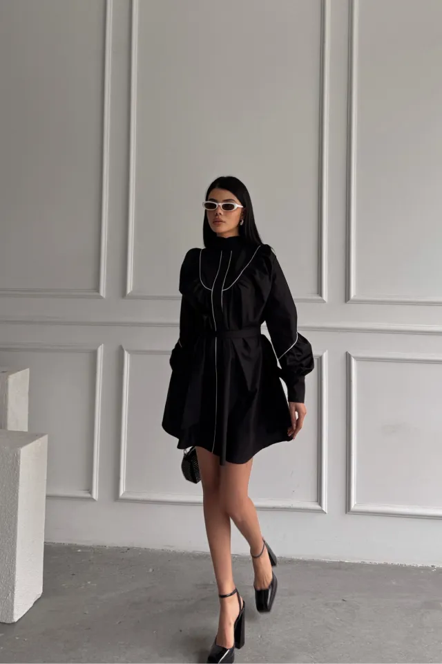 فستان ميدي مخطط بأكمام بالون وشقين عند الفخذ، مزود بتفاصيل أربطة على الخصر لإطلالة أنيقة ومريحة للعيد للنساء.