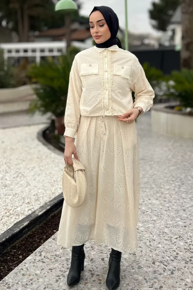 طقم كيمونو بلون موحد مع خصر مطاطي وكتف منخفض، قطعة أساسية محتشمة لموسم الصيف.