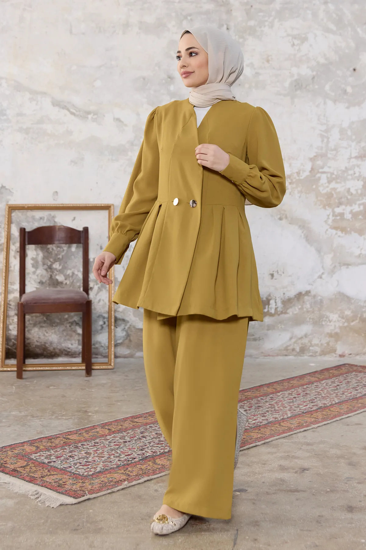 طقم كتان بياقة قميص وأزرار أمامية وجيوب مزدوجة، خفيف ومنعش لإطلالات صيفية محتشمة.