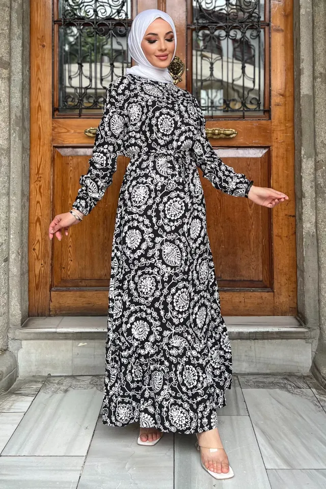 فستان ماكسي نسائي مزخرف بنقشة تقليدية مع أزرار أمامية وأكمام واسعة