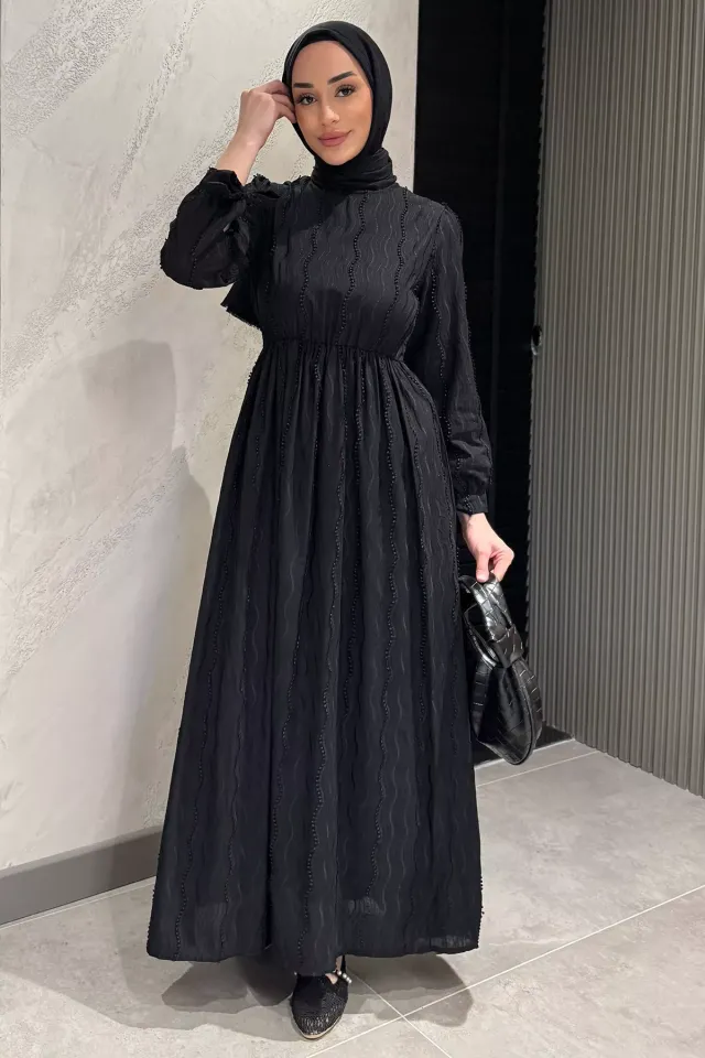 فستان ماكسي مزين بنقشة تقليدية مع أكمام واسعة وياقة صينية وأزرار أمامية. تصميم محتشم ومريح يناسب إطلالات العيد والإجازات الصيفية.