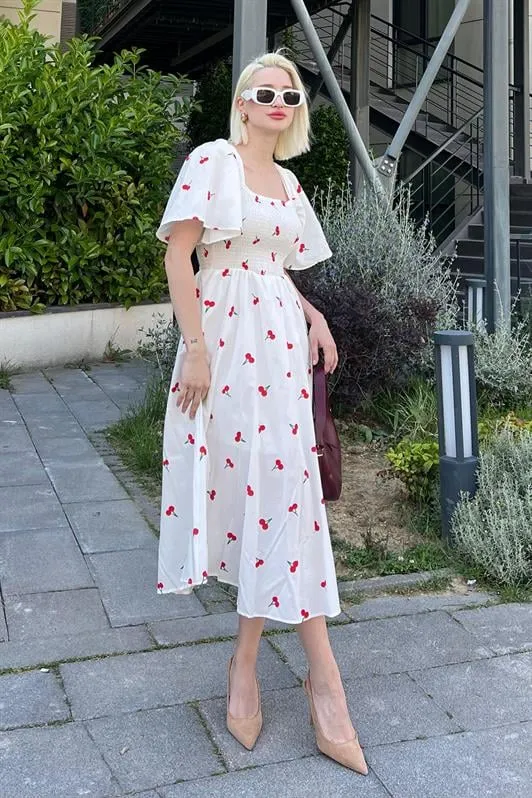 فستان نسائي ميدي من قماش مبّرم بطبقات وأكمام بالون وياقة دائرية مع كسرات منسدلة، خيار ناعم وأنيق لإطلالة العيد.