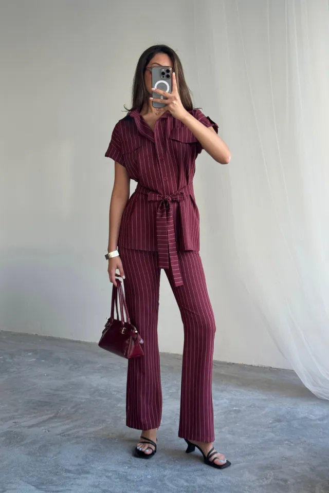 طقم بأكمام نصفية وياقة قميص وسروال واسع مخطط للنساء