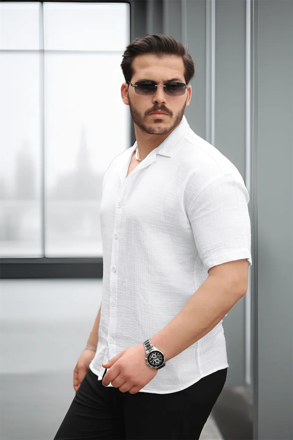 قميص رجالي بقصّة مريحة ومجعّدة وأزرار، مثالي لفصل الصيف. مصنوع من ٦٠٪ قطن، ٢٠٪ فيسكوز، و٢٠٪ كتان لراحة فائقة. يُغسل على درجة حرارة ٣٠ درجة مئوية لأفضل عناية.
