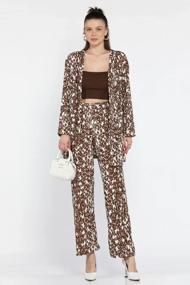 طقم نسائي قطعتين من موسلين بأكمام بالون وتوب مزدوج الصدر وبنطلون ساق واسعة بخصر مطاطي وحزام رباط، مثالي للعيد والراحة اليومية.