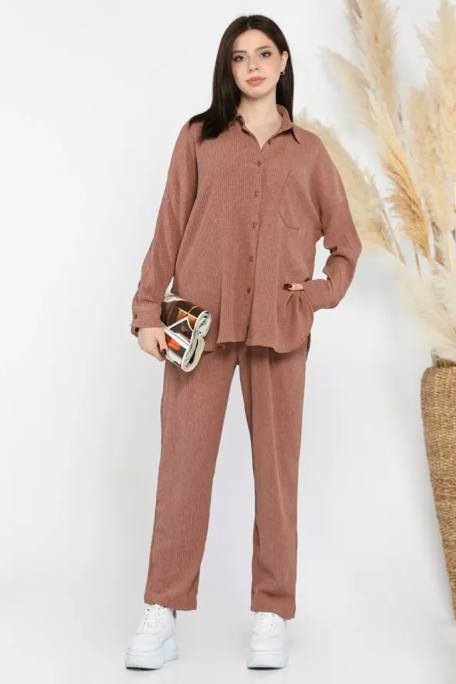 طقم بنطلون صيفي برقبة دائرية وتفاصيل حجرية أمامية للعطلات
