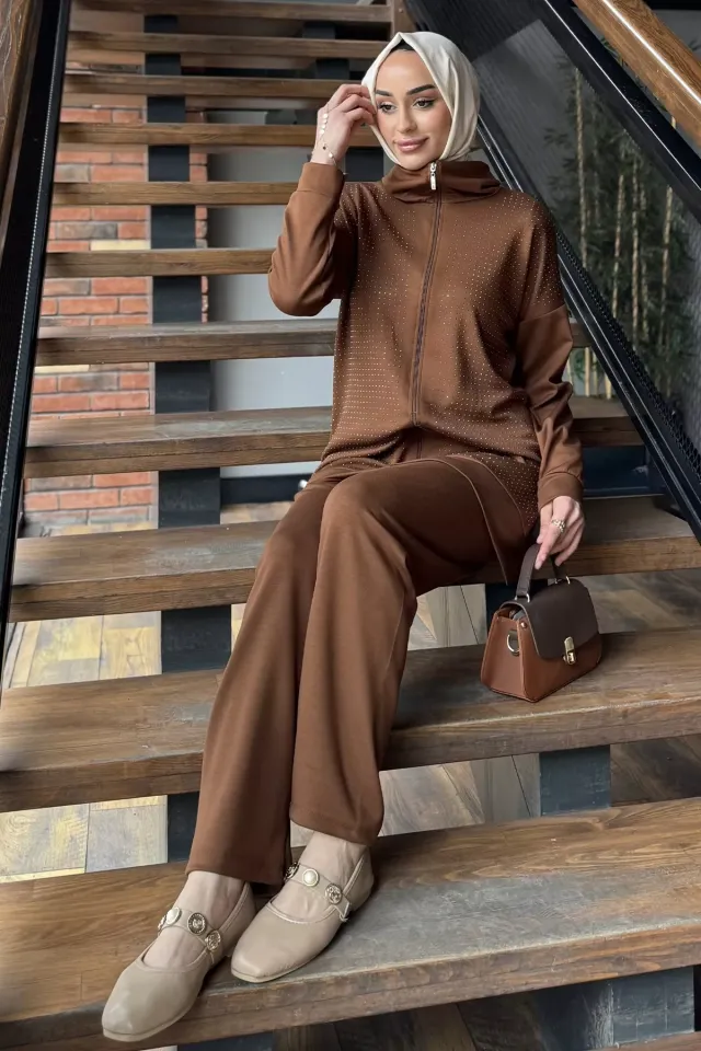 طقم بنطال بياقة دائرية وتفاصيل فراشة حجرية