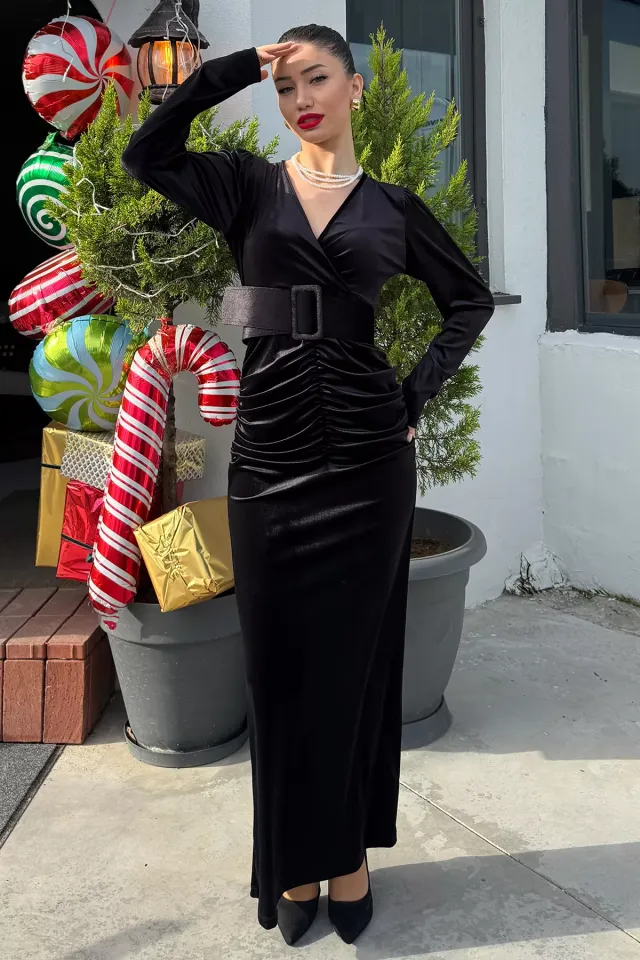 فستان متوسط الطول بقصة A وياقة نصف مدورة مع كسرات وأكمام بالون وشق جانبي، لإطلالة عيد راقية للنساء.