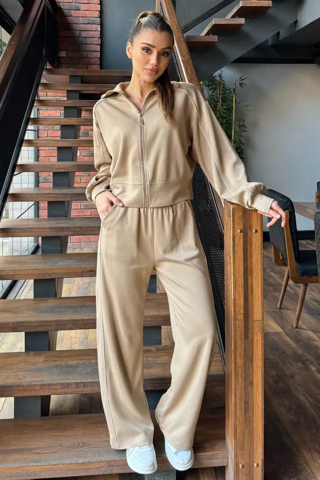 طقم للنساء بقميص بياقة قميص بأكمام طويلة وقصة فضفاضة مع خصر عالي