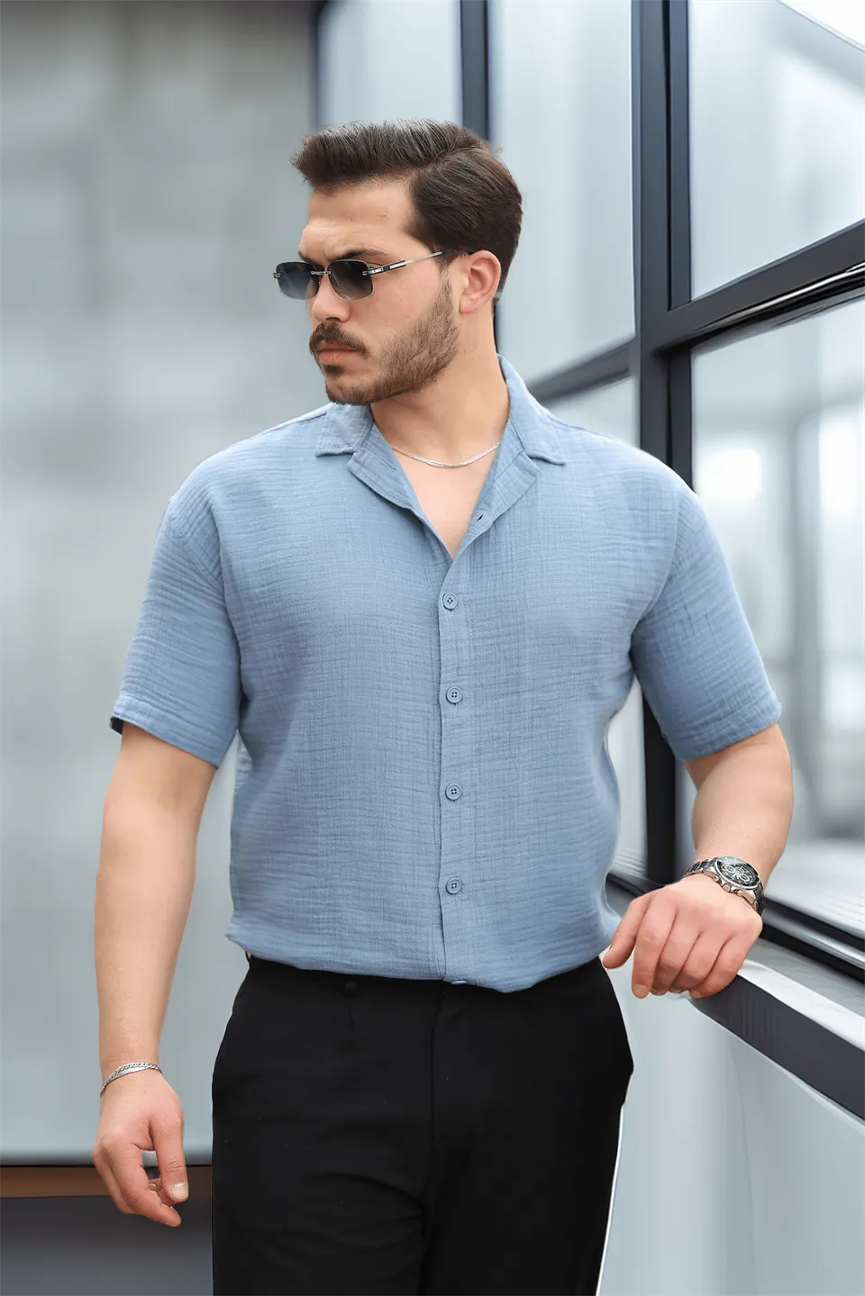 طقم رجالي بأكمام قصيرة وفتحة رقبة على شكل حرف V ورباط خصر، مصنوع من قطن ناعم 100% لراحة مثالية وإطلالة أنيقة تناسب جميع المناسبات. قابل للغسل في الغسالة على درجة حرارة 40 درجة مئوية.
