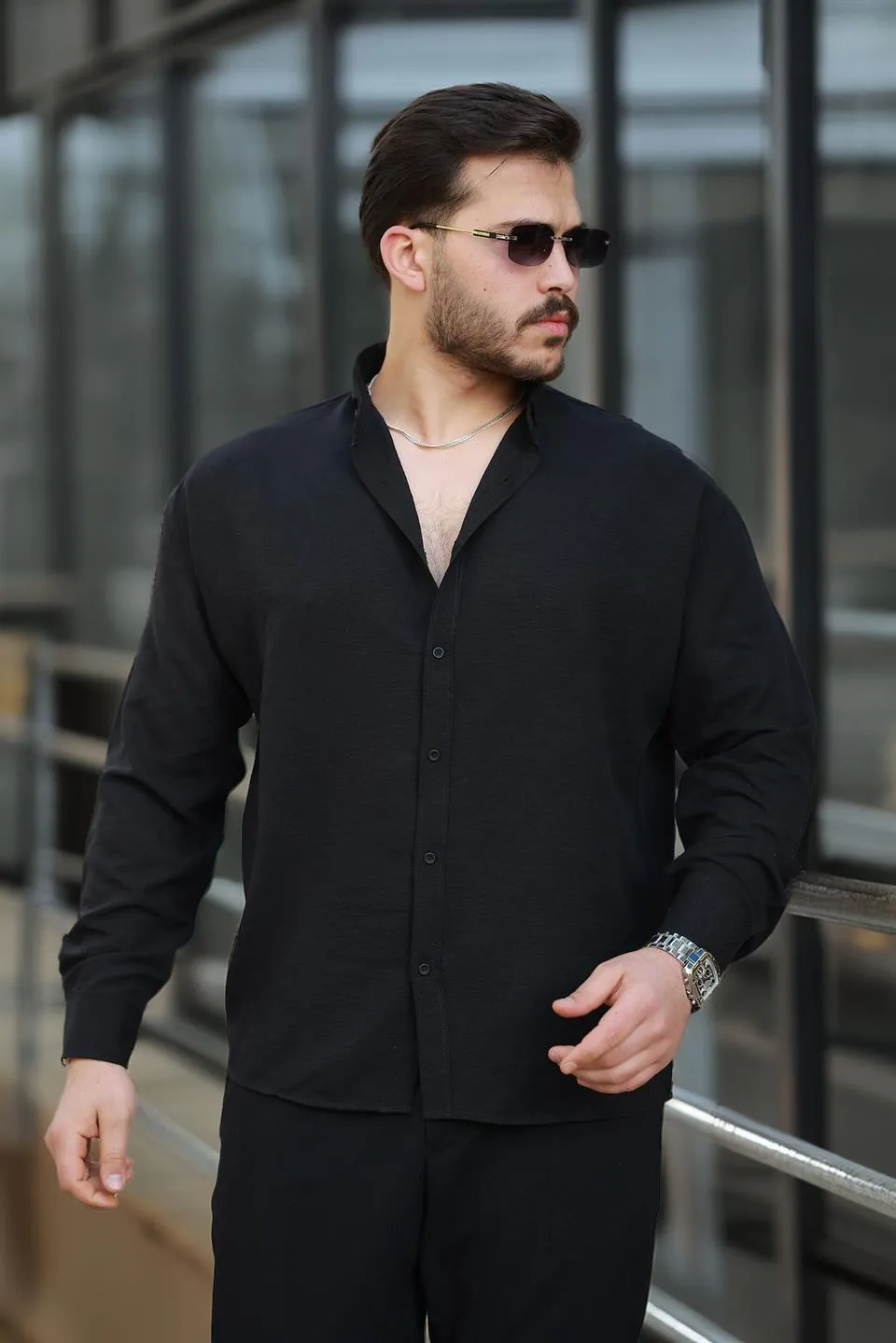 قميص رجالي من القطن المجعد بأكمام طويلة وياقة بأزرار