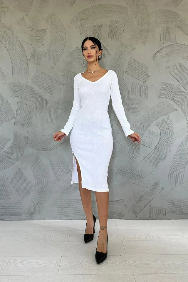 تميزي في العيد مع فستان ميدي ضيق بياقة غير متماثلة وفتحة جانبية لإطلالة أنيقة وجذابة.