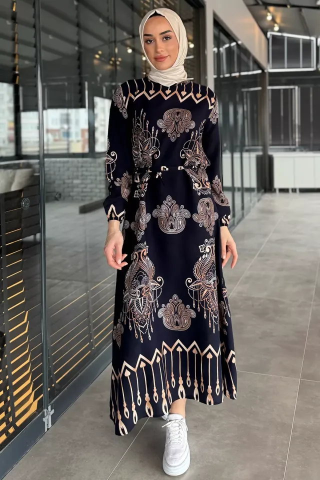 فستان محتشم طويل مزين بتطريز زهور بأكمام طويلة وياقة دائرية