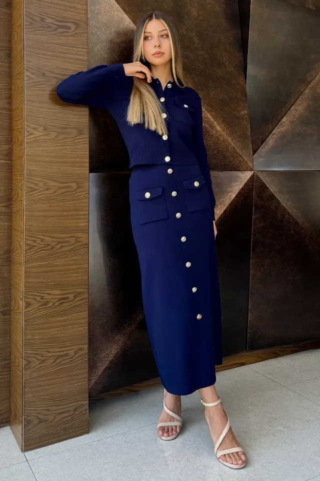 طقم محتشم من تنورة بكسرات وبلوزة بياقة قميص وتفصيل بكلة أمامية