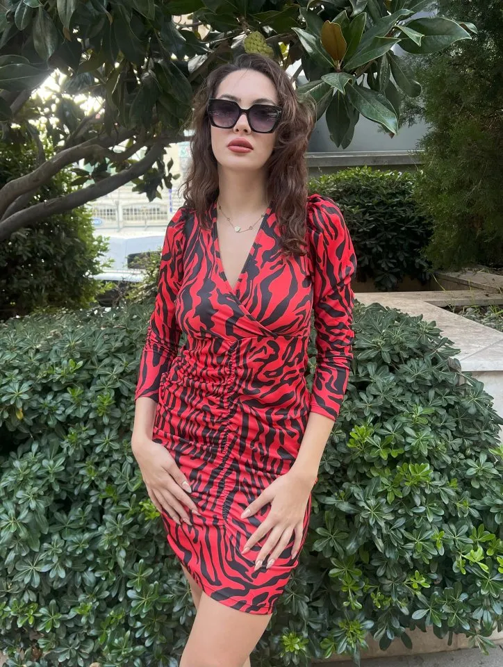 فستان نسائي قصير بقماش ساتان بنقشة ملونة وياقة V وأزرار أمامية مع حزام خصر لإطلالة العيد والصيف المميزة.