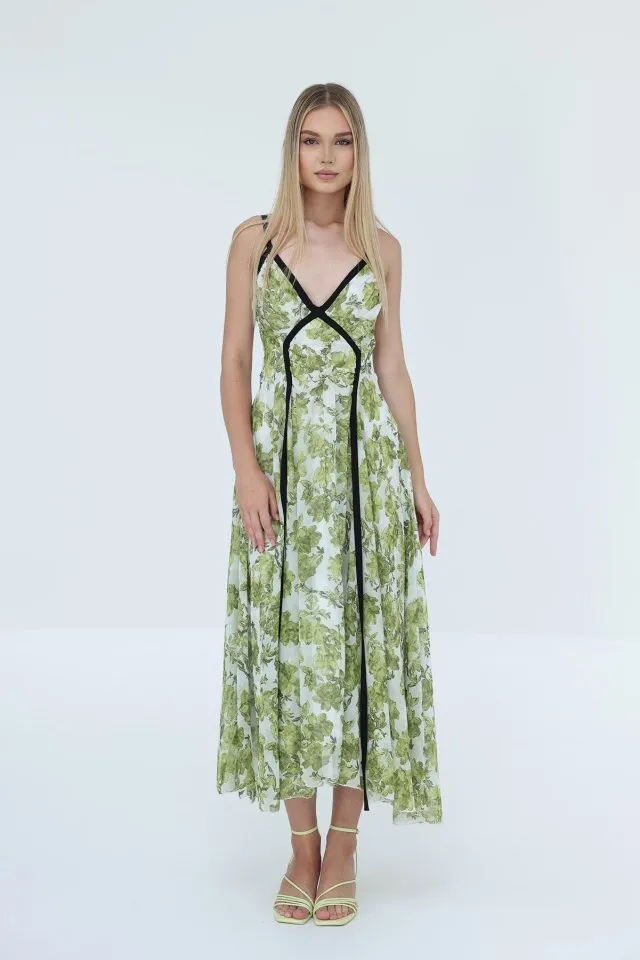 فستان قصير كاشكورسي بقصة ضيقة وياقة بكشكش وربطة أمامية مع حمالات رفيعة