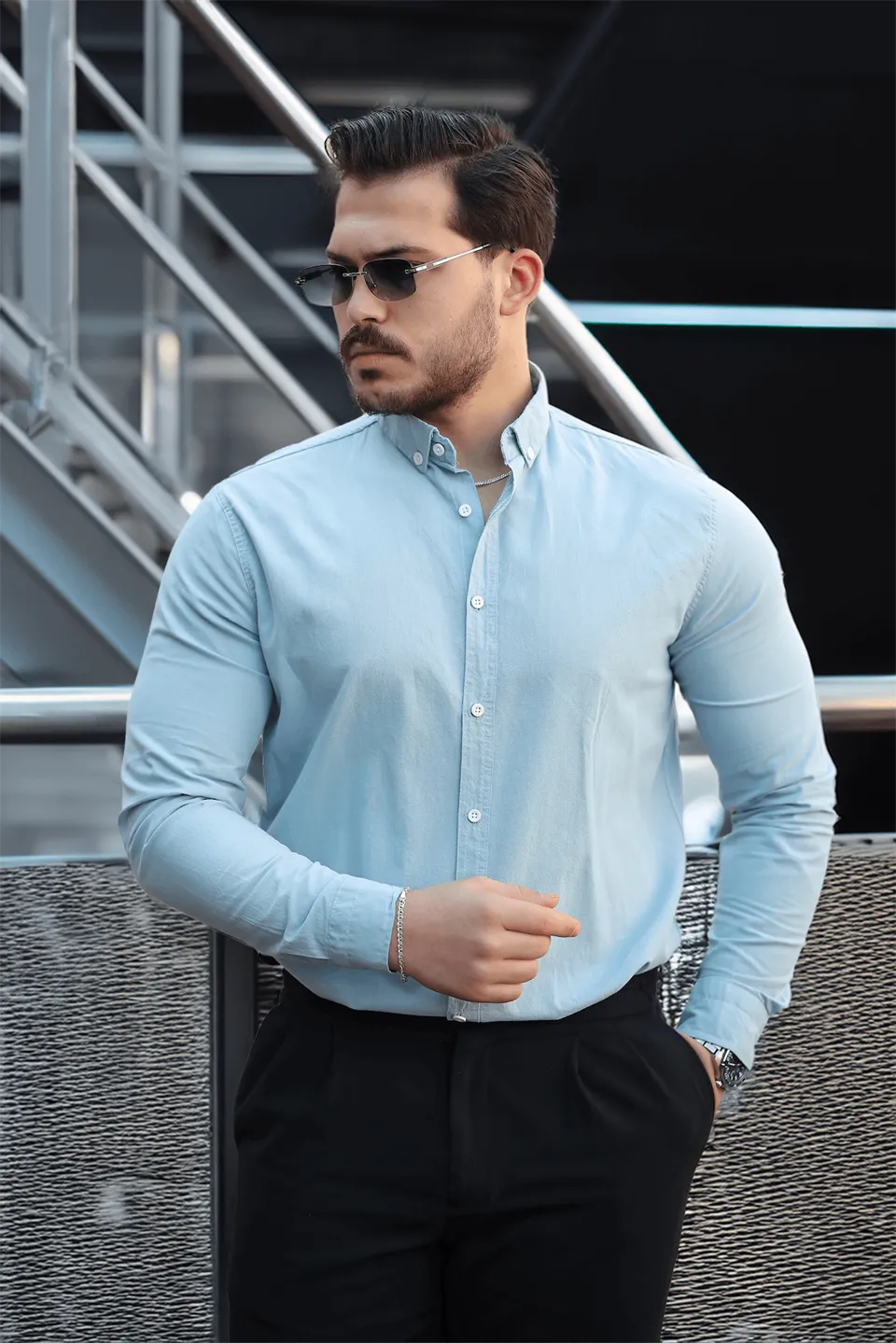 قميص رجالي قطني بأكمام طويلة وأزرار كبس