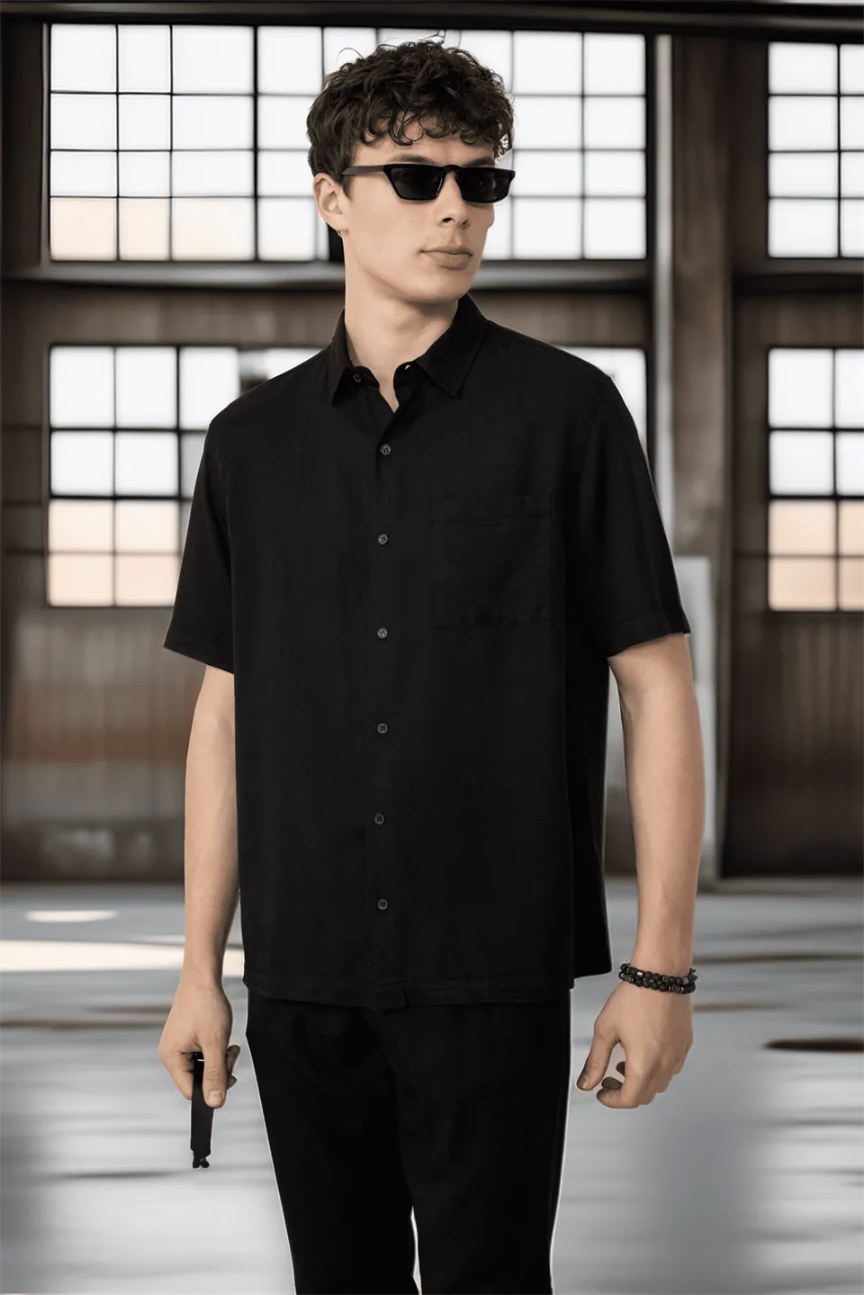 قميص رجالي مخطط من القطن بأكمام قصيرة وياقة بأزرار