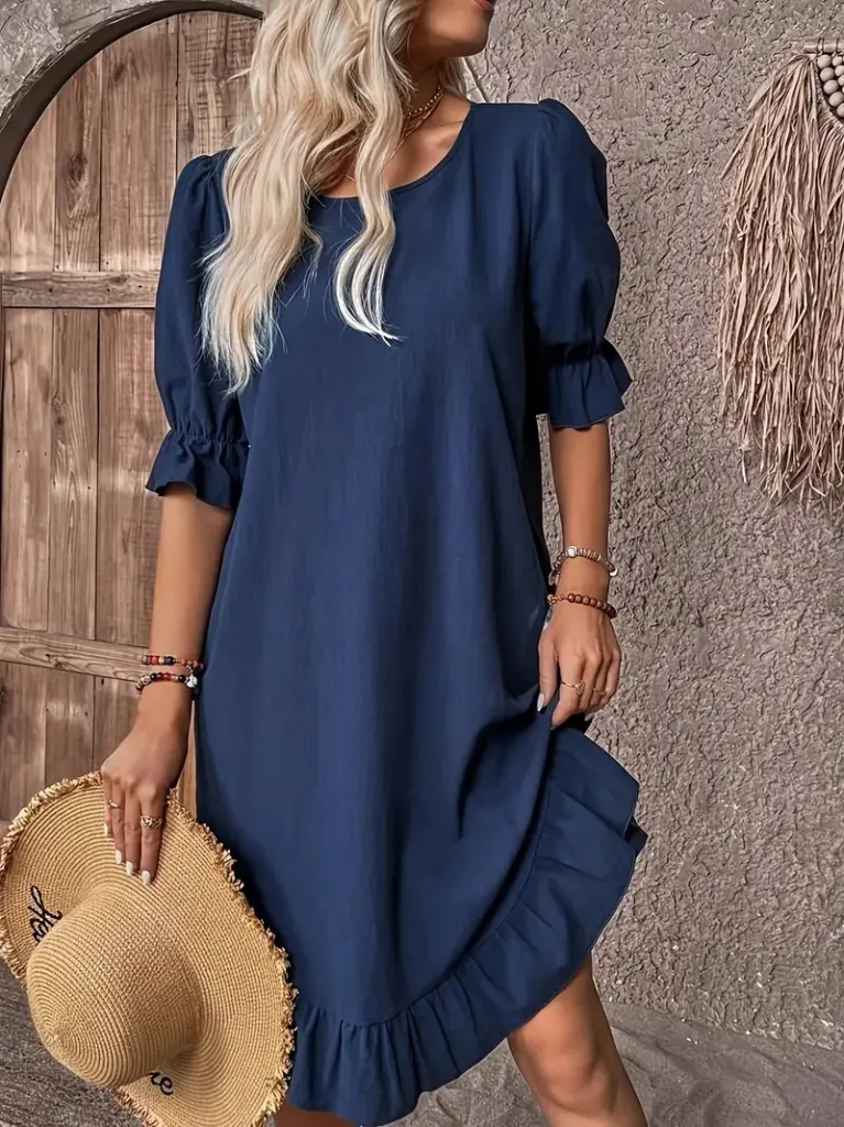 فستان قصير بأكمام قصيرة و ياقة على شكل حرف V للنساء