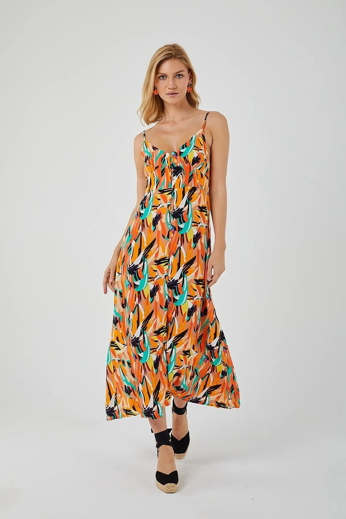 فستان ميدي مخطط بدون أكمام بأزرار أمامية و حزام للنساء