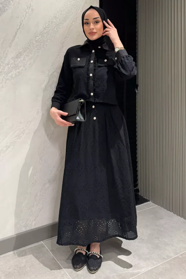 طقم تنورة جينز ماكسي بجيب مزدوج وشريط جانبي للنساء