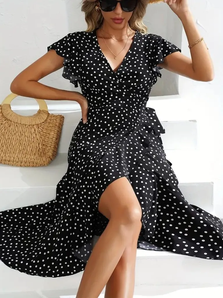 فستان نسائي صيفي متوسط ​​الطول بحزام و تفاصيل مخرمة