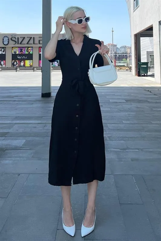 فستان ميني ضيق موحد اللون بياقة دائرية وتفصيل فتحة وأكمام طويلة، مثالي لإطلالة صيفية جريئة.