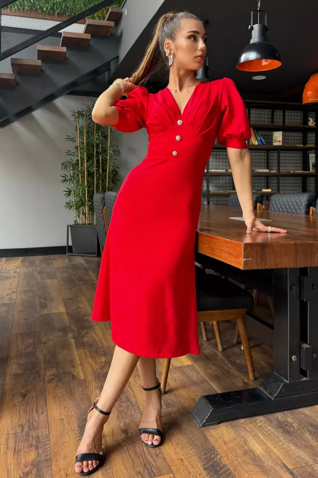 فستان ميني بقصة A بدون أكمام مع ياقة V وأزرار أمامية