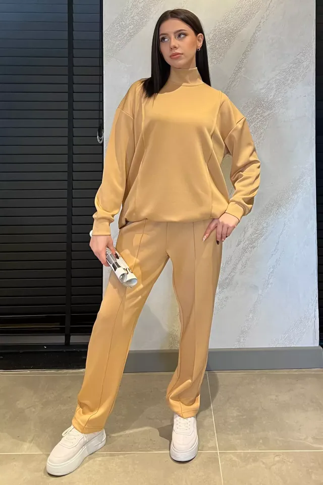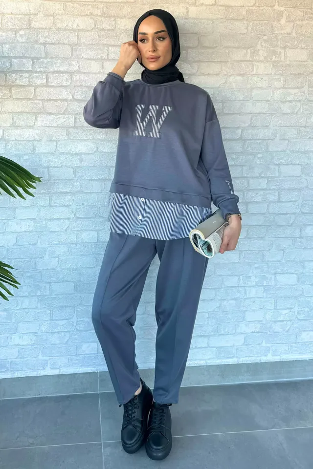 طقم نسائي محتشم بتونيك بطيات أمامية وتفاصيل ترتر لإطلالة أنيقة