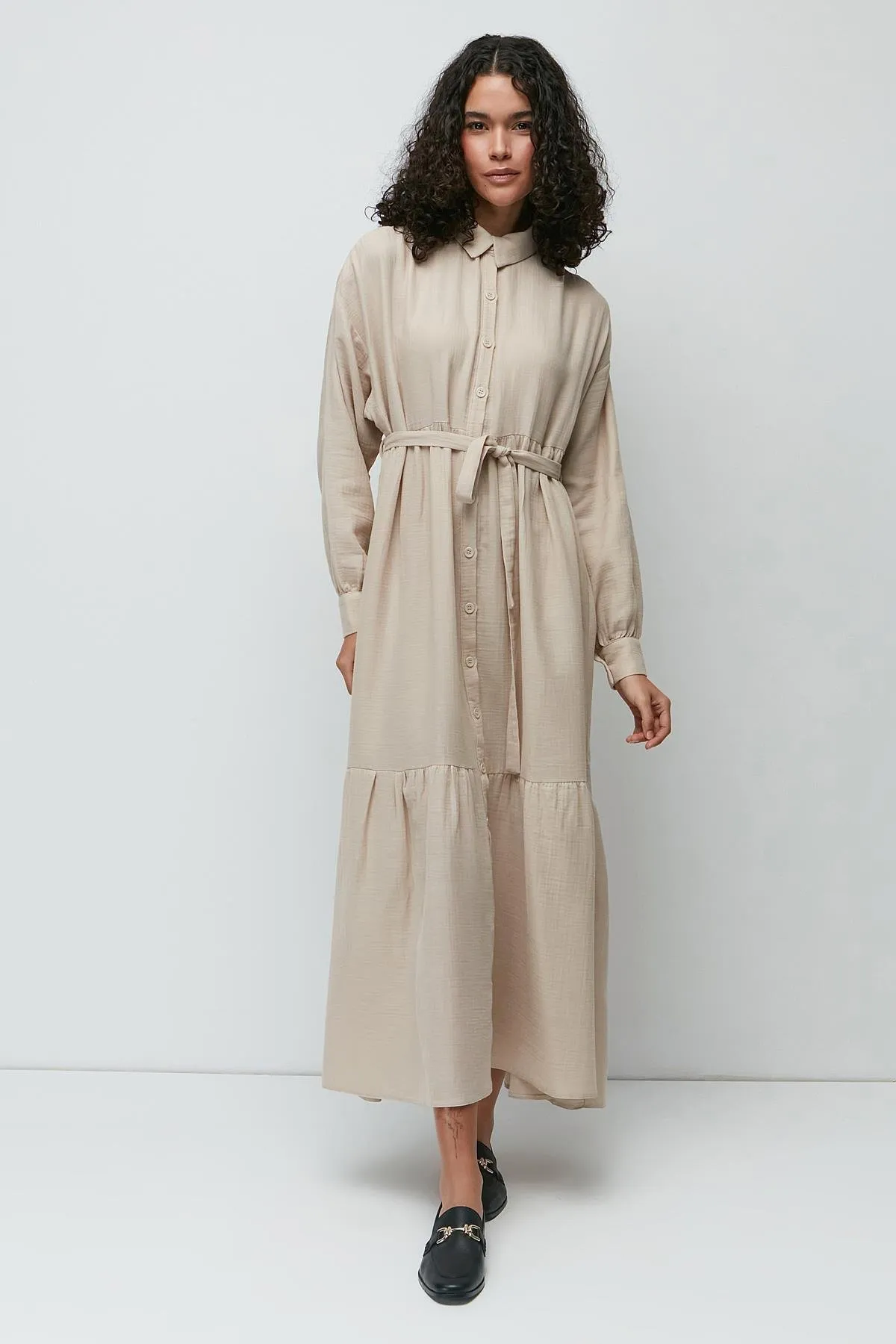 فستان ماكسي محتشم بنقشة أوثنتيك وأكمام منفوخة بياقة صينية لإطلالة منسدلة بطابع بوهو ناعم
