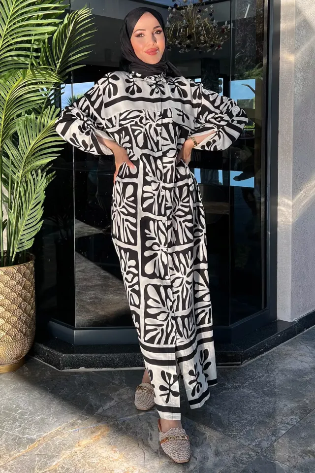 فستان ماكسي مزهر بياقة صينية وأكمام منفوخة لإطلالة محتشمة وأنيقة في الأيام اليومية للنساء