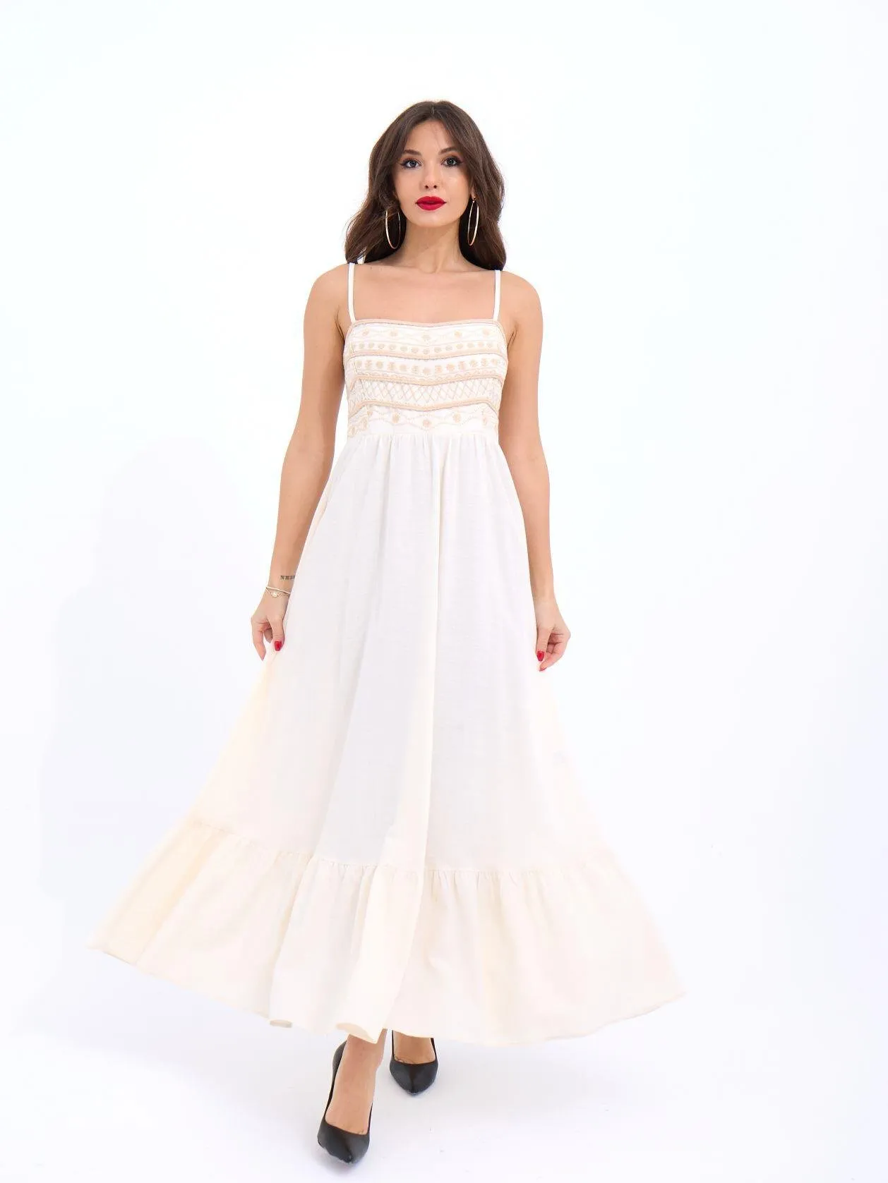 فستان موسلين بياقة V مع أكمام بالون ورباط خصر مزين بخرز لإطلالة صيفية منعشة