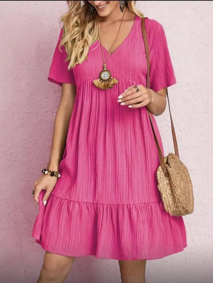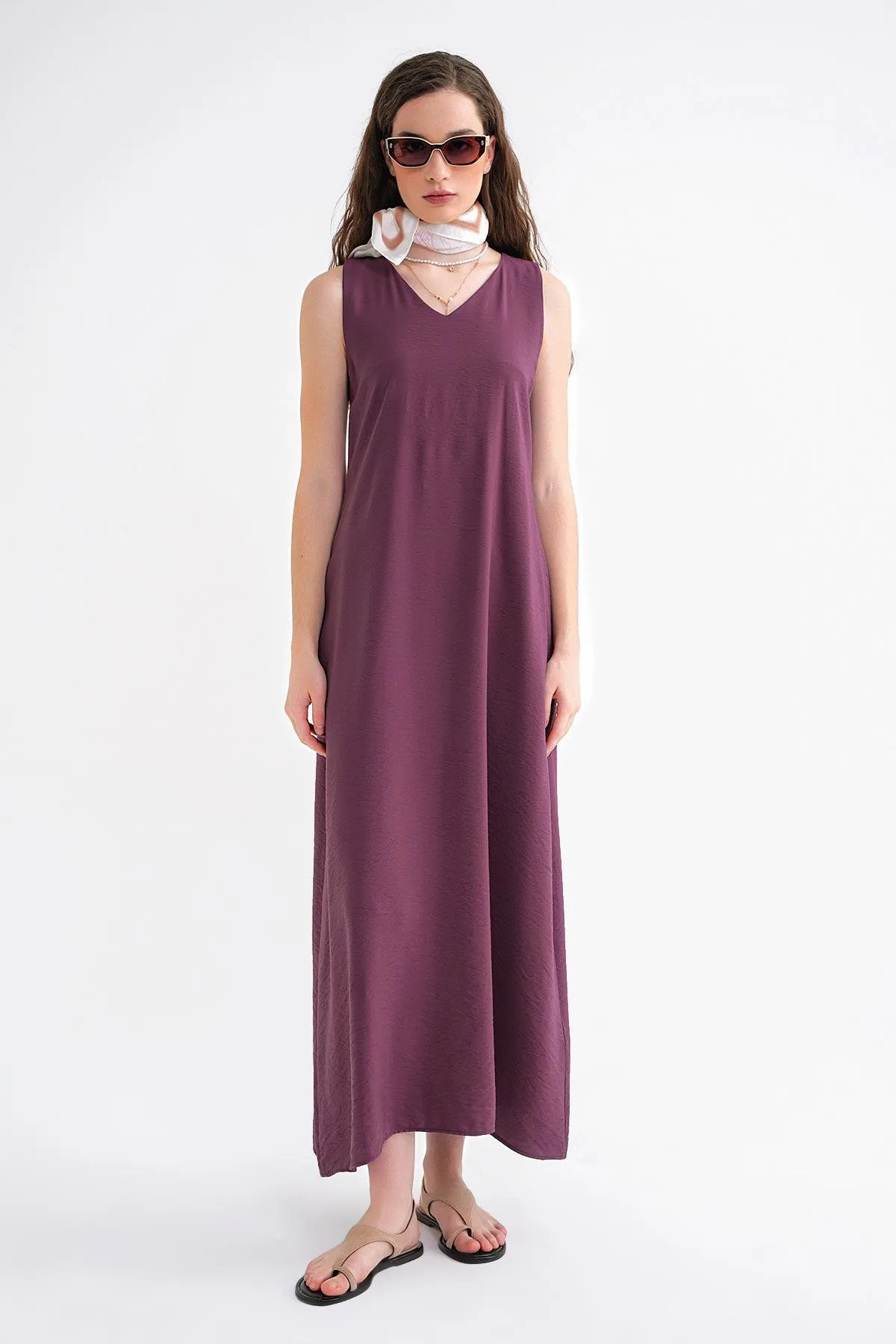 فستان كريب بياقة دائرية بدون أكمام مع درزات مجمعة وحافة غير متماثلة، لإطلالات صيفية أنيقة