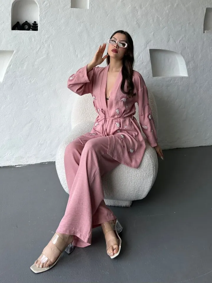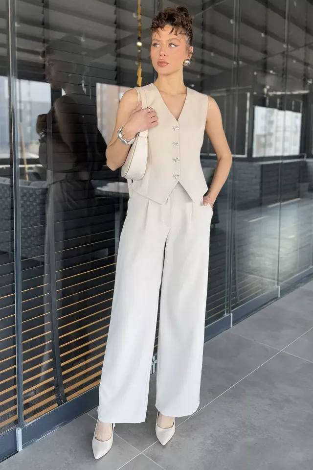 طقم توب كروب بأكمام قصيرة مكشوفة الكتف وياقة كشكش مع بنطلون بخصر مطاطي، أنثوي ومريح لإطلالات الصيف.