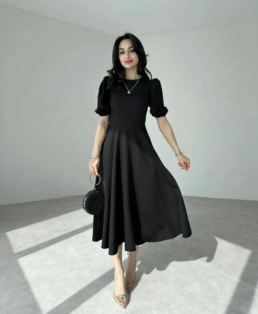 فستان قصير بياقة مربعة واكمام بالون للنساء