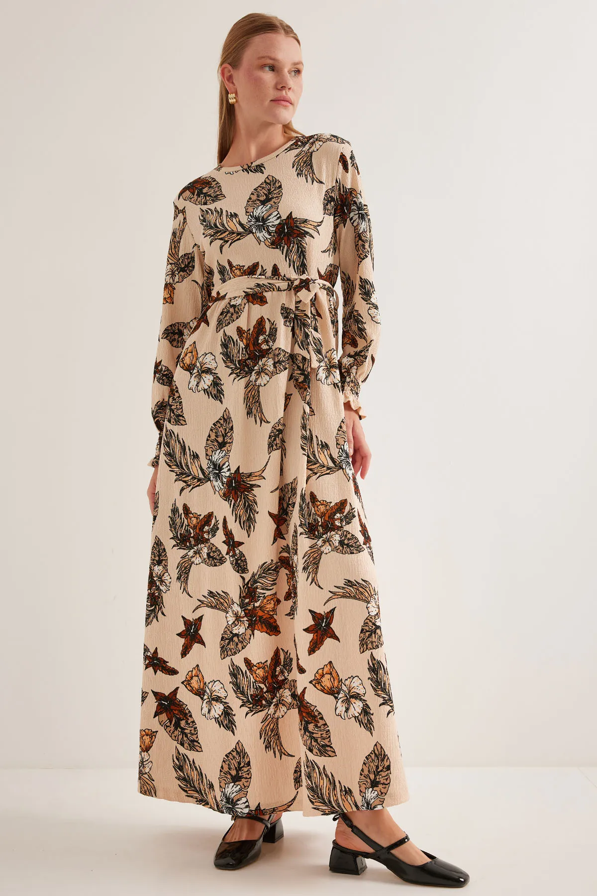 فستان كاجوال منقوش بفتحة رقبة دائرية وتفاصيل مطوية متعددة الطبقات